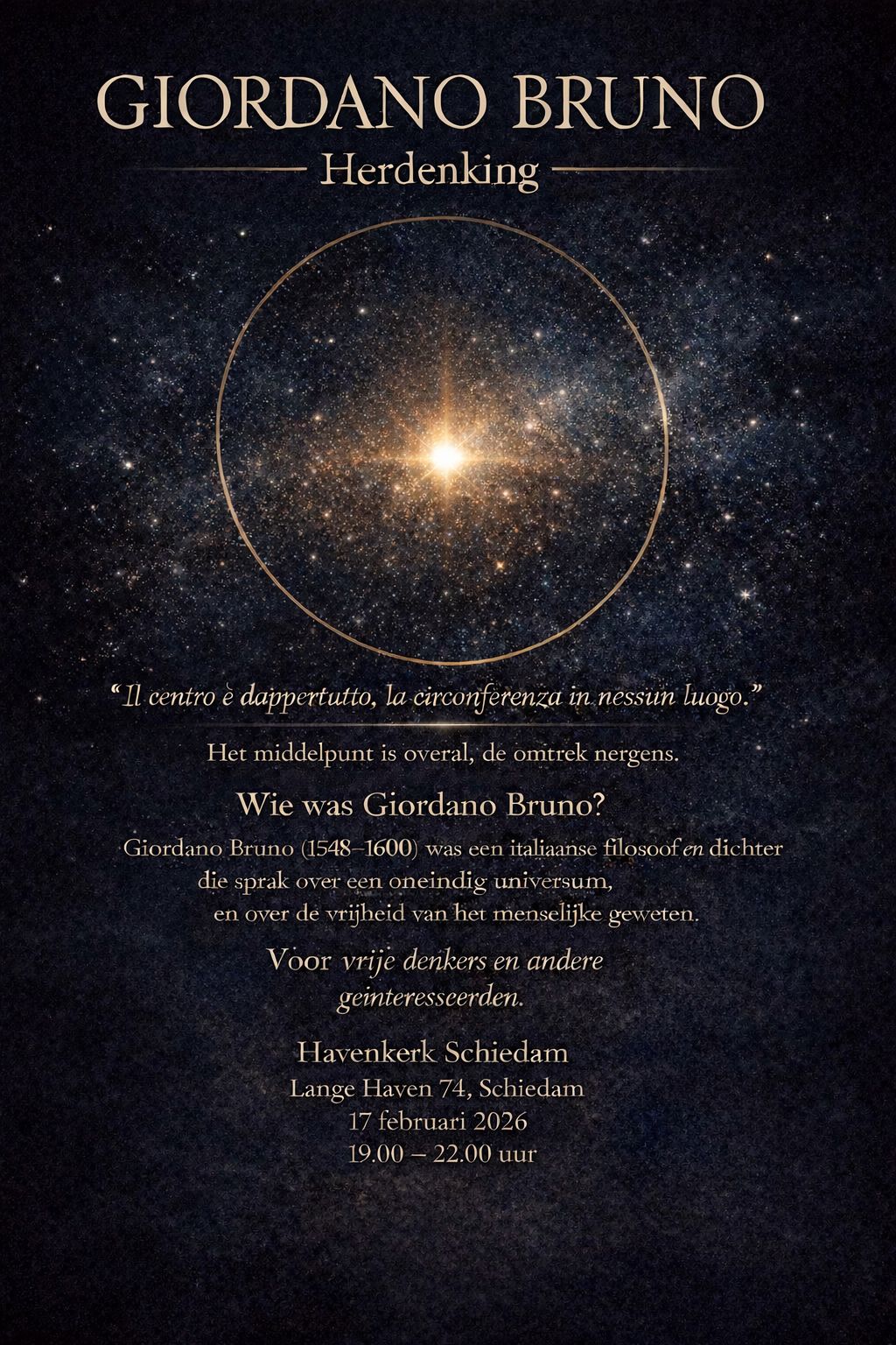 Geïnspireerd door de jaarlijkse herdenking op de Campo de’ Fiori in Rome, organiseren wij op 17 februari 2026 in de Havenkerk te Schiedam — naar ons weten — de eerste openbare Giordano Bruno-herdenking in Nederland.